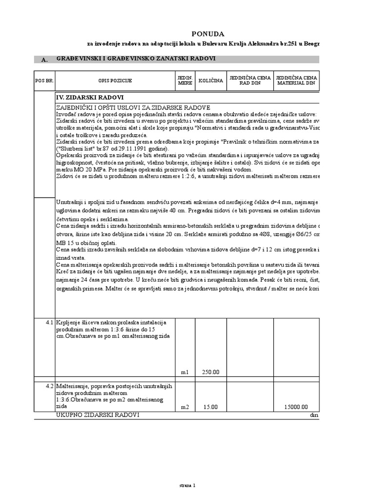 Predmer I Predracun Radova Katalog Sa Opisom Pozicija I